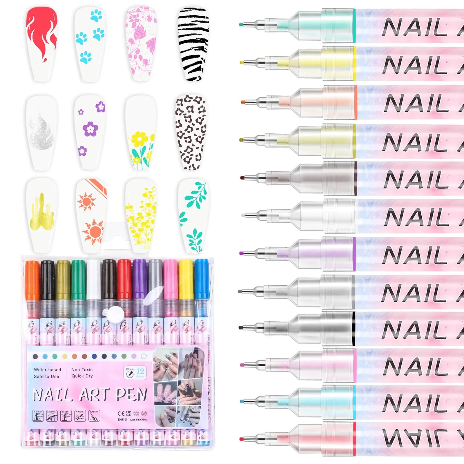Elevate your nail artistry with this 12-piece acrylic paint pen collection featuring a sophisticated palette of black, white, gold, silver, orange, red, pink, yellow, purple, blue, green, and brown. Each pen delivers precision through its fine-tip design, enabling flawless execution of intricate details, delicate lines, and elaborate patterns. The smooth paint flow ensures professional-quality results whether you're creating geometric designs, florals, or decorative embellishments. Ideal for both DIY enthusiasts and seasoned nail technicians, this versatile set accommodates everything from salon applications to personal creative projects. Simply shake before use and prime the tip until ink flows freely. Perfect for gifting or professional use, these pens transform nail design from basic to extraordinary with minimal effort and maximum creative control.